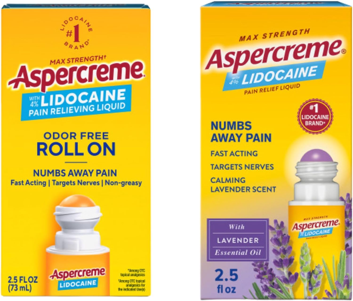 Experience fast and long-lasting relief with Aspercreme Essential Oils Lidocaine Pain Relief Roll-On. This non-irritating topical analgesic numbs away pain with targeted precision. OTC Aspercreme pain relief liquid contains 4% lidocaine, the maximum allowed without a prescription. The non-greasy formula with moisturizing aloe applies without greasy residue or odor. Plus, it contains calming lavender essential oil for a pleasing scent. Aspercreme’s no-mess roll-on applicator keeps hands clean, and it’s travel friendly, making it the perfect pain-relief solution after a workout or on the go. Say goodbye to minor pain with Aspercreme, the No. 1 topical lidocaine brand in the U.S.* *Among OTC topical analgesics